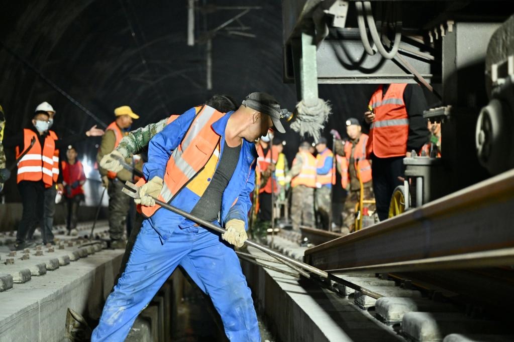 建設(shè)者們?cè)谕瓿扇€鋼軌的最后鋪架。(中國鐵路成都局集團(tuán)公司供圖)