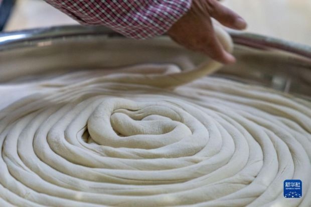 12月12日,在竹塘社區(qū)掛面合作社的掛面車(chē)間,工人將搓好的面放入醒面盆。新華社發(fā)(阮雪楓 攝)