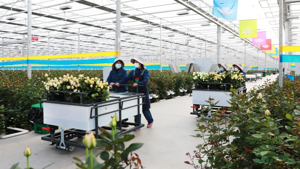 在位于甘肅省臨夏市的百益億農(nóng)國(guó)際鮮花港,工人們正在搬運(yùn)剛剛采摘的玫瑰。(受訪單位供圖)