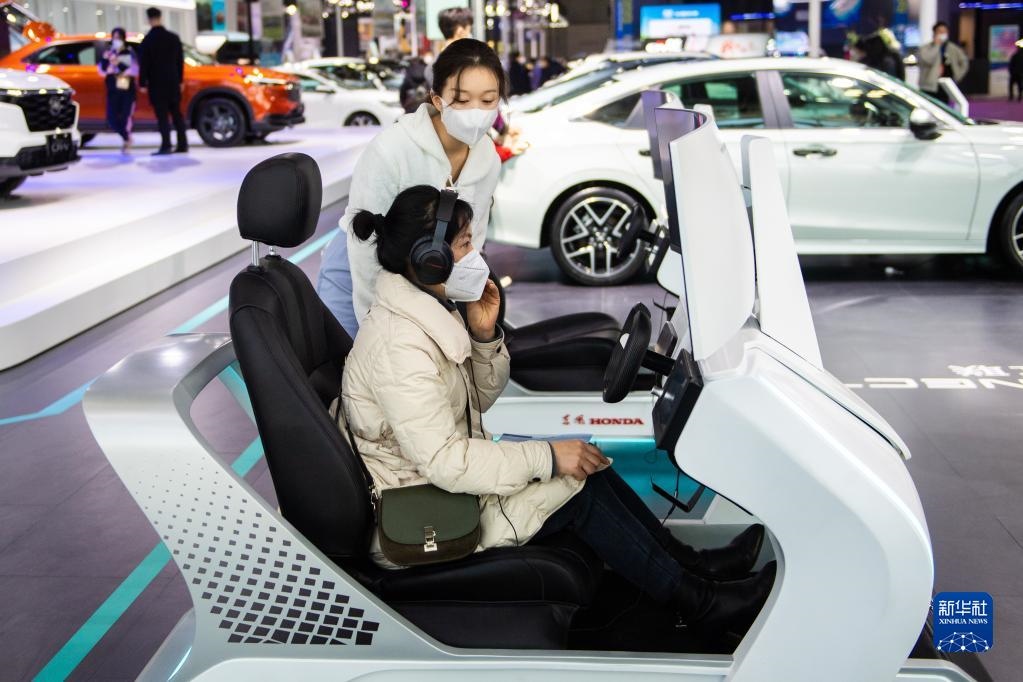 12月24日,在長(zhǎng)沙國(guó)際會(huì)展中心,觀眾(前)在虛擬駕駛艙上體驗(yàn)。新華社記者 陳思汗 攝