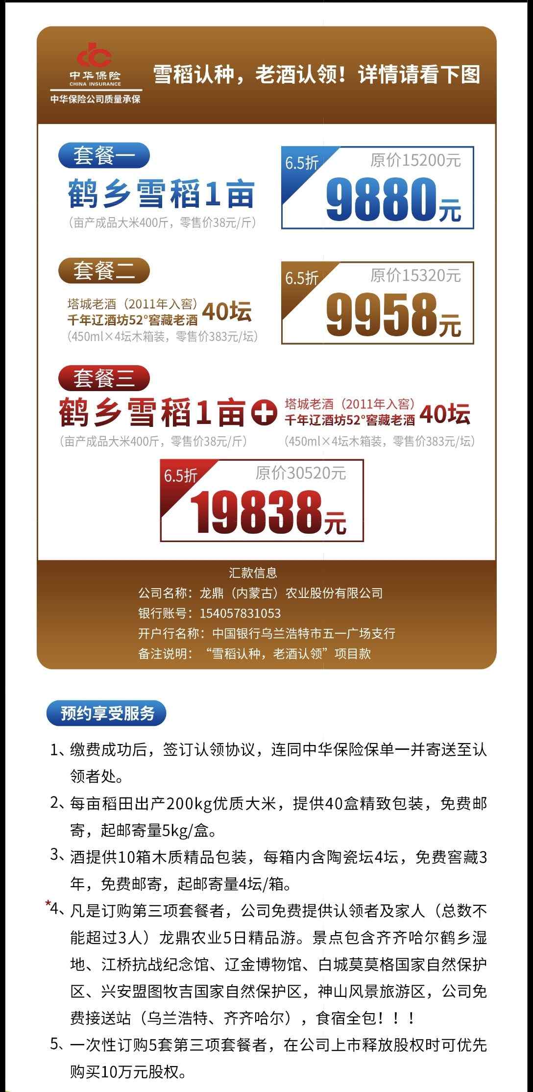 目前,“雪稻認種、老酒認領”共有三種認領套餐(如圖),認領第三種套餐,全家可享有龍鼎農(nóng)業(yè)5日深度精品游,景點包含齊齊哈爾鶴鄉(xiāng)濕地、江橋抗戰(zhàn)紀念館、遼金博物館、白城莫莫格國家自然保護區(qū)、興安盟圖牧吉國家自然保護區(qū)、神山風景旅游區(qū),公司免費接送站(烏蘭浩特、齊齊哈爾) ,食宿全包。