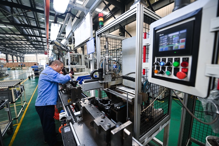 2022年9月27日,在位于浙江省諸暨市店口鎮(zhèn)工業(yè)區(qū)的浙江萬(wàn)安科技股份有限公司數(shù)字化車間內(nèi),工人在流水線上生產(chǎn)作業(yè)。新華社記者 徐昱 攝