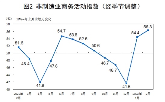 2月份,非制造業(yè)商務(wù)活動指數(shù)為56.3%,比上月上升1.9個百分點(diǎn),連續(xù)兩個月位于景氣區(qū)間,非制造業(yè)恢復(fù)發(fā)展態(tài)勢向好。
