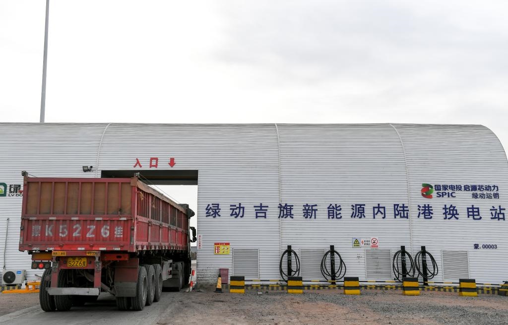 在鄂爾多斯市東勝區(qū)綠動萬利新能源智慧陸港,新能源重卡進行全自動換電。新華社記者貝赫 攝