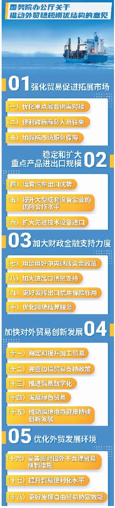 為推動(dòng)外貿(mào)穩(wěn)規(guī)模優(yōu)結(jié)構(gòu),在前期已出臺(tái)多輪政策舉措的基礎(chǔ)上,國(guó)務(wù)院辦公廳4月25日對(duì)外發(fā)布《關(guān)于推動(dòng)外貿(mào)穩(wěn)規(guī)模優(yōu)結(jié)構(gòu)的意見(jiàn)》(以下簡(jiǎn)稱(chēng)《意見(jiàn)》),推出新一輪措施。專(zhuān)家認(rèn)為,此次提出的18條具體措施既涉及重點(diǎn)產(chǎn)品,也關(guān)乎市場(chǎng)拓展和貿(mào)易創(chuàng)新,具有很強(qiáng)的針對(duì)性和操作性,有助于穩(wěn)住外貿(mào)規(guī)模,并在此基礎(chǔ)上進(jìn)一步優(yōu)化外貿(mào)結(jié)構(gòu),推動(dòng)實(shí)現(xiàn)全年進(jìn)出口促穩(wěn)提質(zhì)目標(biāo)任務(wù)。