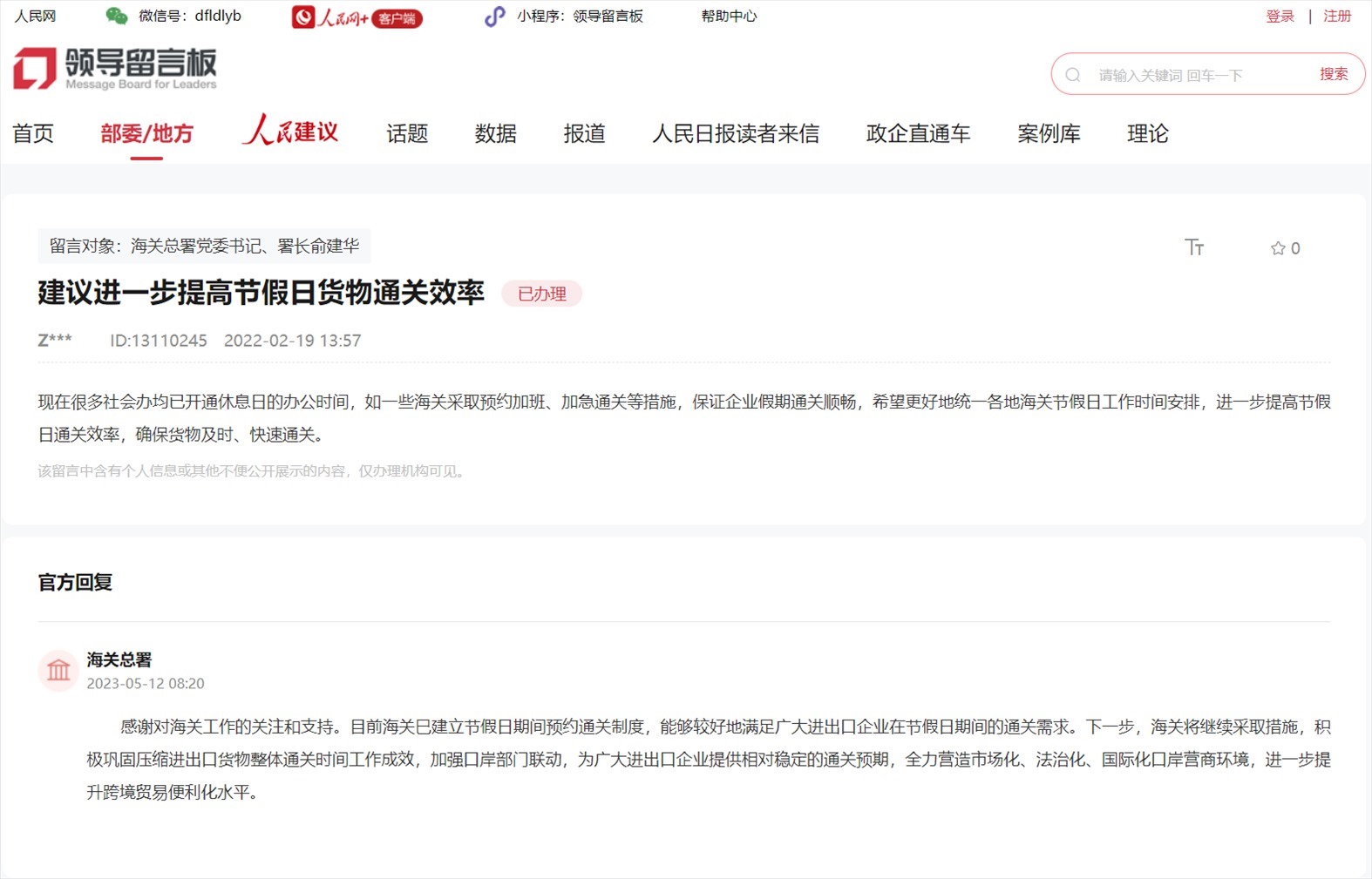 近日,網(wǎng)友通過(guò)人民網(wǎng)“領(lǐng)導(dǎo)留言板”對(duì)全國(guó)海關(guān)積極建言獻(xiàn)策,包括外來(lái)物種入侵、進(jìn)一步提高節(jié)假日貨物通關(guān)效率等方面。