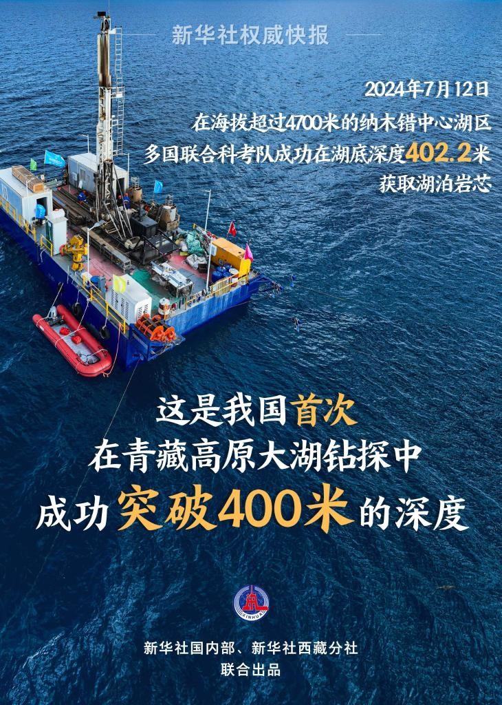 我國青藏高原大湖鉆探深度突破400米 納木錯湖泊科考正在緊密開展。7月12日18時35分,在海拔......
