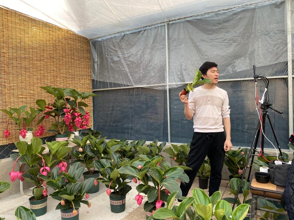李莎莎的花卉大棚內(nèi),主播正在直播銷售寶蓮燈花。新華社記者 陳國(guó)峰 攝