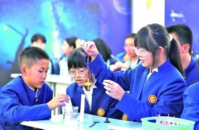 在內(nèi)蒙古阿拉善盟額濟(jì)納旗地面課堂,學(xué)生在做趣味實(shí)驗(yàn)。新華社發(fā)