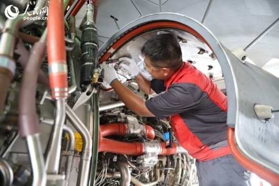 技術(shù)人員對(duì)飛機(jī)進(jìn)行維修。 人民網(wǎng)記者 孟凡盛攝