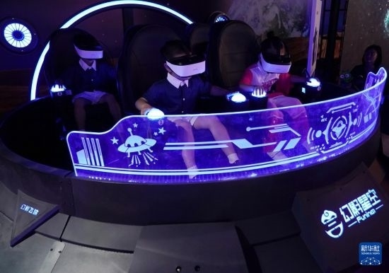 4月27日,小朋友在北京科幻嘉年華現(xiàn)場體驗VR游戲。