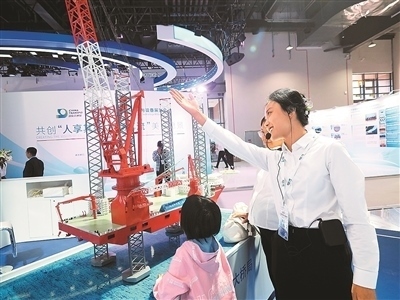 第十六屆國(guó)際交通技術(shù)與設(shè)備展覽會(huì)上,觀眾在參觀“大橋海風(fēng)”號(hào)風(fēng)電安裝船。杜建坡攝(人民圖片)