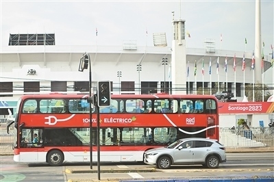 在智利首都圣地亞哥,一輛新能源公交車(chē)行駛在街頭。這條路線的十輛雙層新能源公交車(chē)由中國(guó)制造。近年來(lái),中國(guó)制造的新能源汽車(chē)不斷進(jìn)入智利市場(chǎng),憑借綠色環(huán)保的特點(diǎn)和先進(jìn)科技的應(yīng)用廣受當(dāng)?shù)孛癖姷那嗖A。新華社記者 辛悅衛(wèi)攝