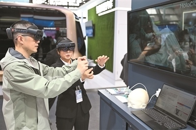 在2024年世界互聯(lián)網(wǎng)大會(huì)“互聯(lián)網(wǎng)之光”博覽會(huì)上,參觀者體驗(yàn)一款全息智能醫(yī)學(xué)影像系統(tǒng)做手術(shù)的過(guò)程。新華社記者 蔡湘鑫攝