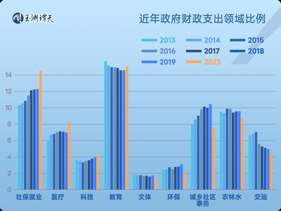 統(tǒng)計數(shù)據(jù)顯示,近年來,我們的財政支出結(jié)構(gòu)已經(jīng)變得更加有針對性,定向投資綠色經(jīng)濟、民生領(lǐng)域、高技術(shù)等有利于民的行業(yè)。在去年的財政支出結(jié)構(gòu)中,社保就業(yè)、教育這類民生領(lǐng)域一直占據(jù)大頭。其中,社保就業(yè)、醫(yī)療的財政投入漲幅遠超其他類目。