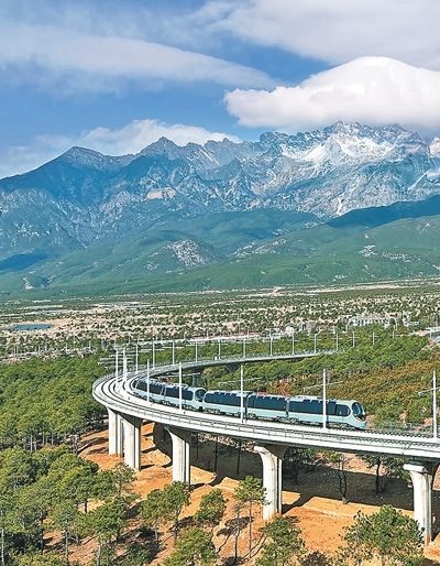 雪山、繁花與牧場,構成了一幅美麗畫卷,令人陶醉其中?!帮L景太美了!”游客賴先生是第二次來云南麗江,這次旅行他體驗了麗江雪山觀光火車。自2月12日開通以來,麗江雪山觀光火車迅速成為旅游界的新“爆款”。這列由我國自主研發(fā)的全球首列全景觀光山地旅游列車,以其獨特的設計和舒適的體驗,為游客帶來一場別具一格的雪山之旅,更成為連接麗江古城與玉龍雪山的“黃金紐帶”。
