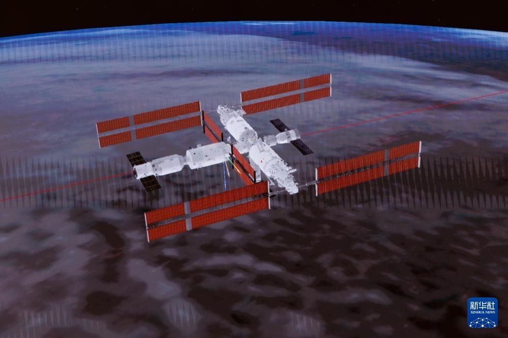 4月24日在北京航天飛行控制中心拍攝的神舟二十號(hào)載人飛船成功對(duì)接空間站天和核心艙畫面。新華社記者 金立旺 攝