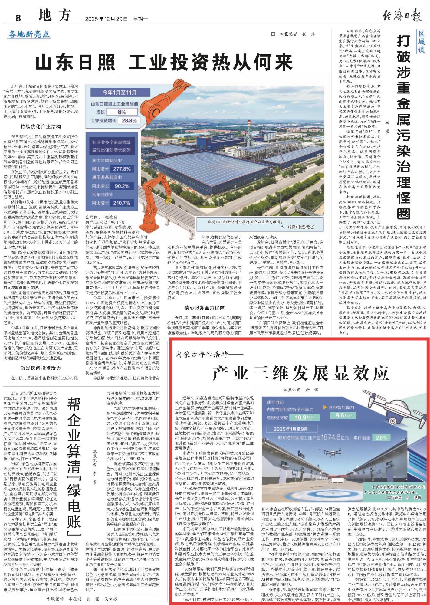 2025年12月29日,《經(jīng)濟(jì)日?qǐng)?bào)》第8版刊發(fā)題為《內(nèi)蒙古呼和浩特——產(chǎn)業(yè)三維發(fā)展顯效應(yīng)》的文章,報(bào)道了內(nèi)蒙古自治區(qū)呼和浩特市堅(jiān)持以現(xiàn)代化產(chǎn)業(yè)體系為引領(lǐng),通過(guò)鏈?zhǔn)秸稀^(qū)域協(xié)同與創(chuàng)新驅(qū)動(dòng),推動(dòng)產(chǎn)業(yè)向高端化、智能化、綠色化轉(zhuǎn)型,培育新質(zhì)生產(chǎn)力,形成“傳統(tǒng)產(chǎn)業(yè)升級(jí)+新興產(chǎn)業(yè)突破+未來(lái)產(chǎn)業(yè)培育”的三維發(fā)展模式。