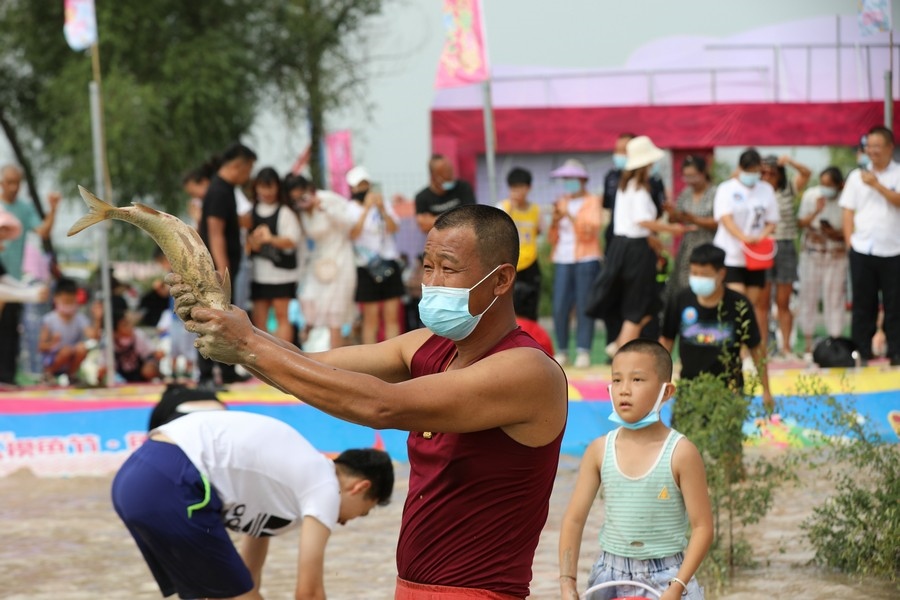 隨著主持人的一聲號令,來自呼和浩特市區(qū)和土默特左旗的眾多參與者,挽起褲管,光著腳丫,沖進池塘,展開了一場摸魚大比拼。