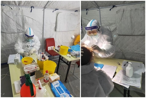 每天她們?cè)谂R時(shí)搭建的帳篷中連續(xù)工作十幾個(gè)小時(shí),有時(shí)候檢查的人數(shù)較多,還需要加班加點(diǎn),她經(jīng)常累得腰酸背痛,回到駐地一倒頭就睡著了。