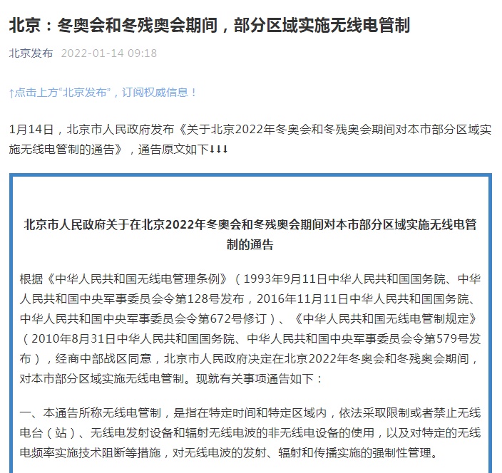根據(jù)《中華人民共和國無線電管理條例》《中華人民共和國無線電管制規(guī)定》,經(jīng)商中部戰(zhàn)區(qū)同意,北京市人民政府決定在北京2022年冬奧會和冬殘奧會期間,對本市部分區(qū)域?qū)嵤o線電管制。具體有關(guān)事項通告如下: