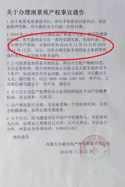 對于賈麗娟的說法,南景苑小區(qū)的居民告訴記者:“2019年11月11日,天威房地產(chǎn)公司曾在小區(qū)張貼過一則關于辦理南景苑產(chǎn)權事宜通告,公告中已經(jīng)明確,2019年11月11日天威房地產(chǎn)和業(yè)主代表、賽罕區(qū)遺留辦協(xié)調(diào),有欠款的業(yè)主在一周內(nèi)交清欠款,無違約金,正常辦理分戶手續(xù)。這充分說明了我們不需要在交納違約金暨滯納金,賈麗娟所說的滯納金明顯與當年的通告內(nèi)容相違背。再說,天威房地產(chǎn)公司營業(yè)執(zhí)照處于吊銷狀態(tài),好多地方存在違約行為,按合同約定公司應該賠償給居民的錢誰來負責?”(北方新報正北方網(wǎng)首席記者 高志華 實習生 張子椒)