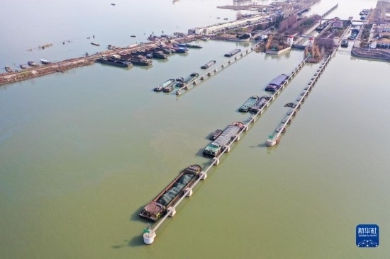 2月14日,貨船有序通過位于江蘇宿遷的京杭大運河皂河船閘(無人機(jī)照片)。