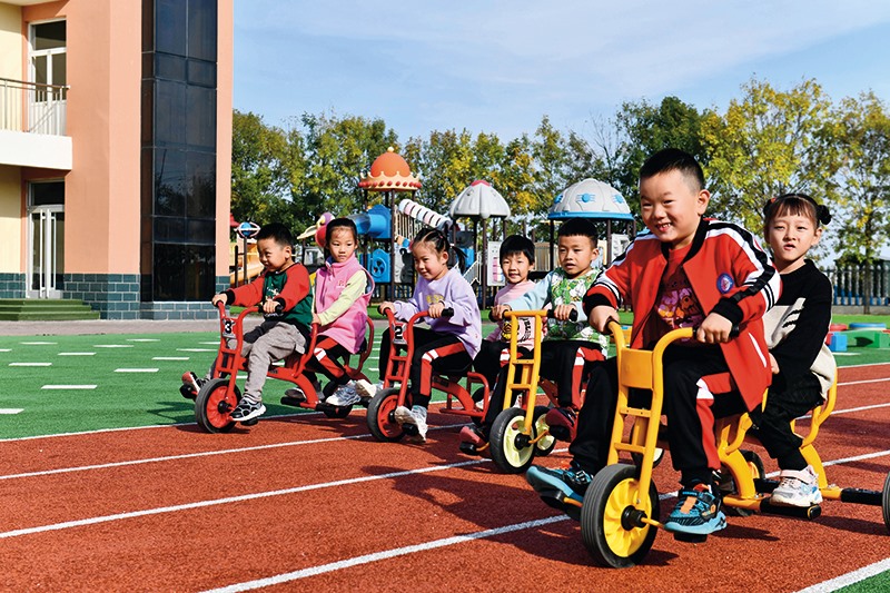 在山東省東營(yíng)市墾利區(qū)楊廟社區(qū)幼兒園,孩子們?cè)诶蠋煹膸ьI(lǐng)下進(jìn)行戶外活動(dòng)(2021年10月19日攝) 郭緒雷攝