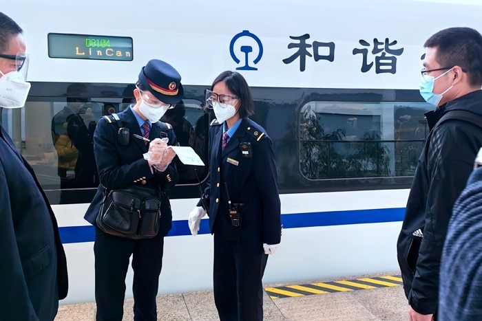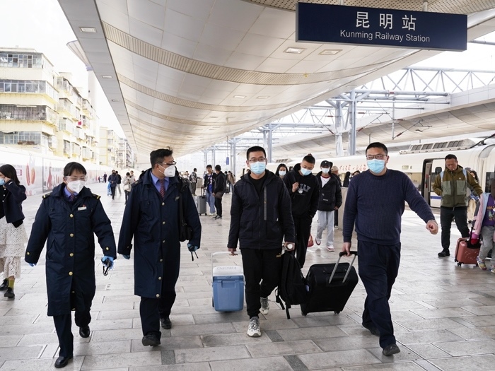 云縣站工作人員引導(dǎo)醫(yī)務(wù)人員進(jìn)入站臺(tái)乘坐動(dòng)車。中國鐵路昆明局集團(tuán)有限公司供圖