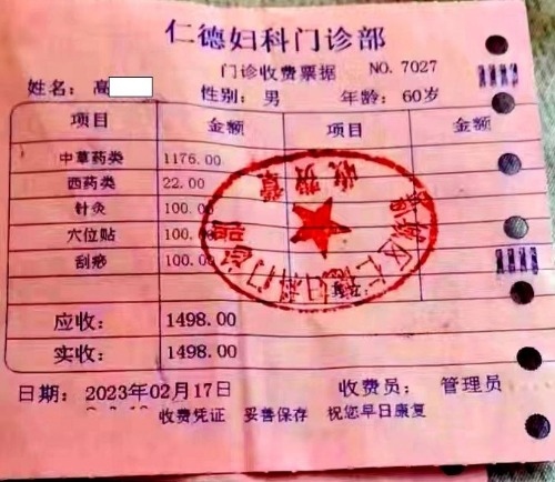 高先生被說動(dòng)了,在王女士的陪同下來到了這名男子口中的“仁德醫(yī)院”。進(jìn)去以后,發(fā)現(xiàn)醫(yī)院的名字叫“仁德婦科門診”。醫(yī)生確實(shí)如男子所說的那樣,告訴高先生不用做手術(shù),給開了1498元的中藥和中醫(yī)治療項(xiàng)目(如圖)。