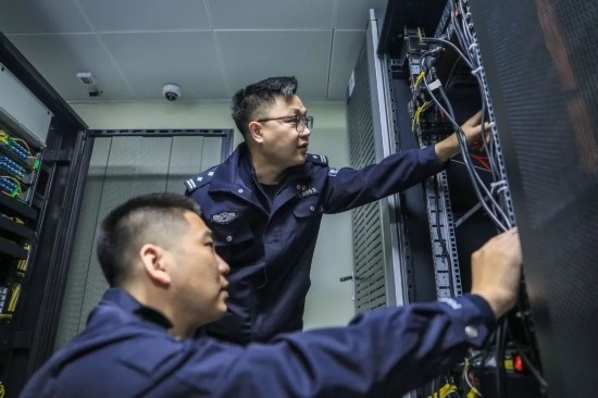 圖為歐陽軒乾與同事對服務器開展技術巡檢,及時排查故障隱患。