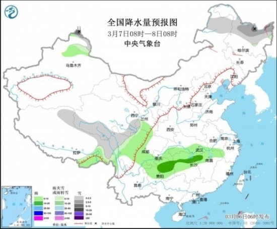 圖1 全國降水量預報圖(3月6日08時-7日08時)
