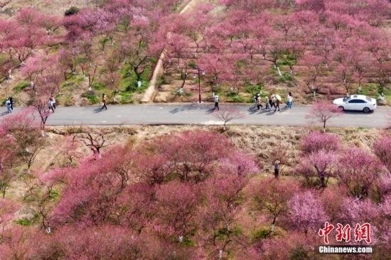 3月9日,江蘇南京,郊外盛開的梅花接連成片,呈現(xiàn)“粉色海洋”。(無人機(jī)照片)中新社記者 泱波 攝