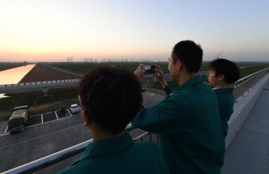 3月14日,在西平縣老王坡高標準服務(wù)中心的二樓平臺,臺曉林(右)、王英凡和王仲琦(左)下班后在看夕陽。