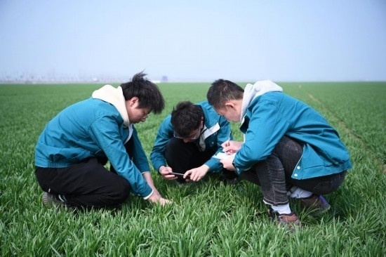 2月28日,在西平縣老王坡高標準農(nóng)田示范區(qū),臺曉林(左)、王仲琦和王英凡(右)一起觀察苗情草情并記錄。