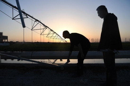 3月14日,在西平縣老王坡高標準農(nóng)田示范區(qū),劉亞輝(左)在調(diào)整噴灌機的移動方向。