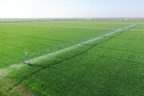 這是3月14日拍攝的西平縣老王坡高標準農(nóng)田里正在澆水的平移式水肥一體化噴灌機(無人機照片)。