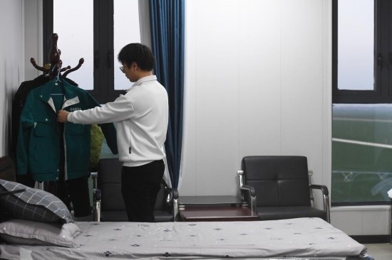 3月14日,在西平縣老王坡高標準服務(wù)中心的宿舍內(nèi),臺曉林下班后換下工作服、整理衣架。