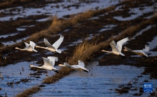 3月20日,在內(nèi)蒙古自治區(qū)呼和浩特市托克托縣黃河沿岸,幾只天鵝在空中飛翔。