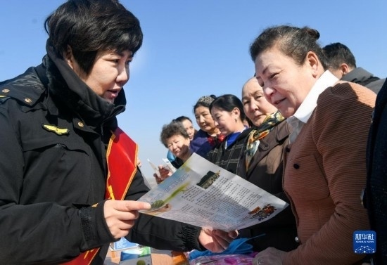 3月22日,在烏魯木齊水業(yè)集團(tuán)有限公司烏拉泊水庫管理站,烏魯木齊市生態(tài)環(huán)境局天山區(qū)分局工作人員(左)給居民講解烏魯木齊飲用水的來源。
