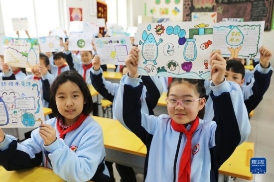 3月22日,河南省平頂山市寶豐縣山河路小學(xué)學(xué)生展示自己制作的節(jié)水護(hù)水畫報(bào)。