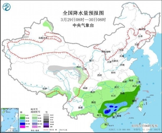 3月29日08時至30日08時,青海南部和東部、川西高原北部等地部分地區(qū)有小雪或雨夾雪。江南中東部和南部、華南大部等地部分地區(qū)有中到大雨,其中,廣西東部、廣東西部等地部分地區(qū)有暴雨(50~70毫米)。黑龍江西北部部分地區(qū)有4~5級風(見圖3)。