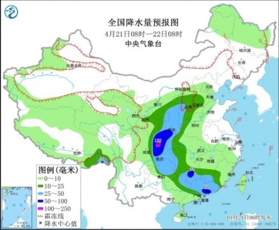 4月21日08時至22日08時,新疆沿天山高海拔地區(qū)和南疆南部、西藏北部和東部、青海東部、甘肅中南部、寧夏、陜西北部、山西中北部等地部分地區(qū)有小到中雪或雨夾雪,其中甘肅南部、山西西部局地有大到暴雪(10~18毫米);西北地區(qū)東南部、華北中南部、西南地區(qū)東部、江漢西部、江南中南部、華南北部和東部等地部分地區(qū)有中到大雨,其中,四川盆地東部、重慶西部、湖南南部、廣東東部等地部分地區(qū)有暴雨或大暴雨(100~120毫米)。內蒙古東北部、黑龍江東北部、浙江北部等地部分地區(qū)有4~6級風。渤海海域、黃海海域、東海北部、臺灣海峽將有6~7級風,陣風8~9級。