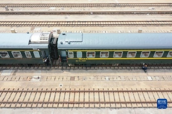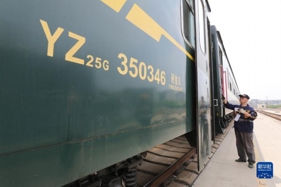 4月28日,中國鐵路上海局集團(tuán)有限公司徐州站的鐵路連結(jié)員在對臨時旅客列車進(jìn)行拉風(fēng)作業(yè)(無人機(jī)照片)。