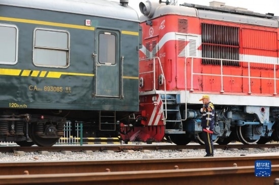 4月28日,中國鐵路上海局集團(tuán)有限公司徐州站的鐵路連結(jié)員在進(jìn)行單機(jī)連掛車輛作業(yè)。