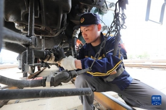 4月28日,中國鐵路上海局集團(tuán)有限公司徐州站的鐵路連結(jié)員在核對現(xiàn)車編組。