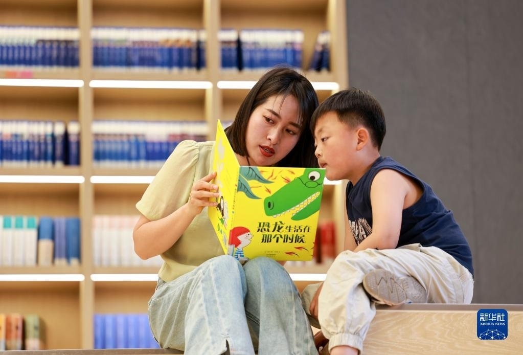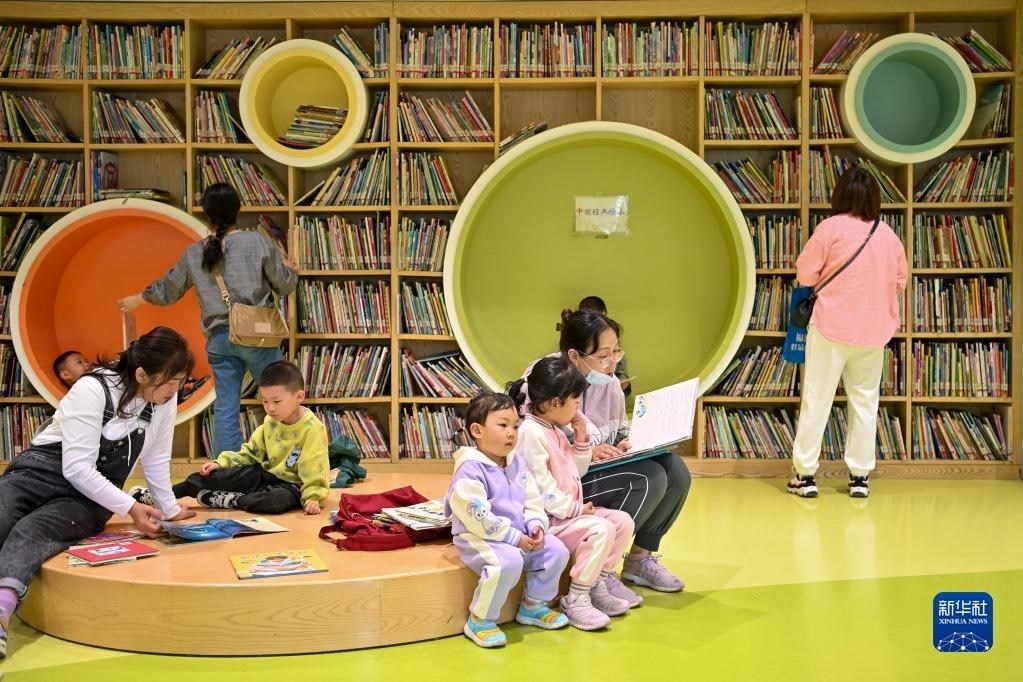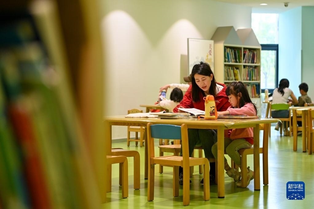 5月2日,一名家長帶著小朋友在江蘇省泰興市新時代文明實踐中心城市書房閱讀。