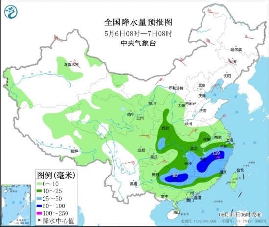 5月6日08時(shí)至7日08時(shí),陜西中南部、江漢大部、江淮西部、江南、西南地區(qū)東北部、華南北部等地部分地區(qū)有中到大雨,其中,湖南南部、江西中部和東北部、浙江西南部、福建西北部、廣西北部等地部分地區(qū)有暴雨或大暴雨(100~110毫米)。內(nèi)蒙古中部和西北部、黑龍江東北部、吉林中部、新疆沿天山地區(qū)、河南南部、四川盆地西北部、四川南部、貴州東北部等地部分地區(qū)有4~6級(jí)風(fēng),其中,內(nèi)蒙古東北部、新疆北疆北部等地部分地區(qū)有6~7級(jí)風(fēng)。