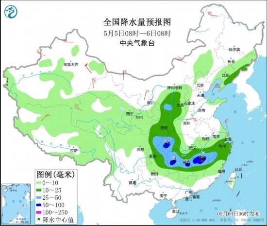 5月4日08時(shí)至5日08時(shí),湖北南部和東部、安徽南部、湖南東北部、江西中北部、浙江西部、江蘇南部以及山東半島、遼寧南部、河北東部等地部分地區(qū)有大到暴雨,其中,安徽南部、江西北部等地部分地區(qū)有大暴雨(100~120毫米)。上述部分地區(qū)伴有短時(shí)強(qiáng)降水(最大小時(shí)降雨量20~40毫米,局地可超過(guò)50毫米),局地有雷暴大風(fēng)等強(qiáng)對(duì)流天氣。內(nèi)蒙古中部、黑龍江東北部、新疆南疆盆地、甘肅河西、山東半島等地部分地區(qū)有4~6級(jí)風(fēng),其中,新疆東部部分地區(qū)有8~9級(jí)風(fēng)。渤海、渤海海峽、黃海大部、東海北部海域?qū)⒂?~8級(jí)、陣風(fēng)9~10級(jí)的大風(fēng)。