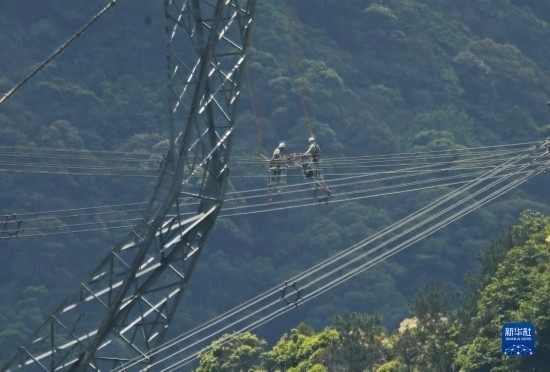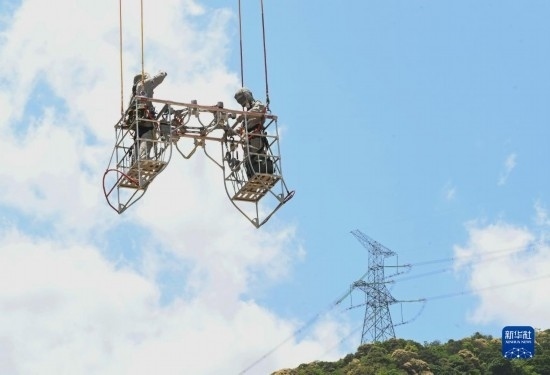 5月4日,在福建省寧德市洪口鄉(xiāng),國網(wǎng)福建超高壓公司帶電班檢修工周曉剛(右)對輸電線路進行帶電作業(yè)。